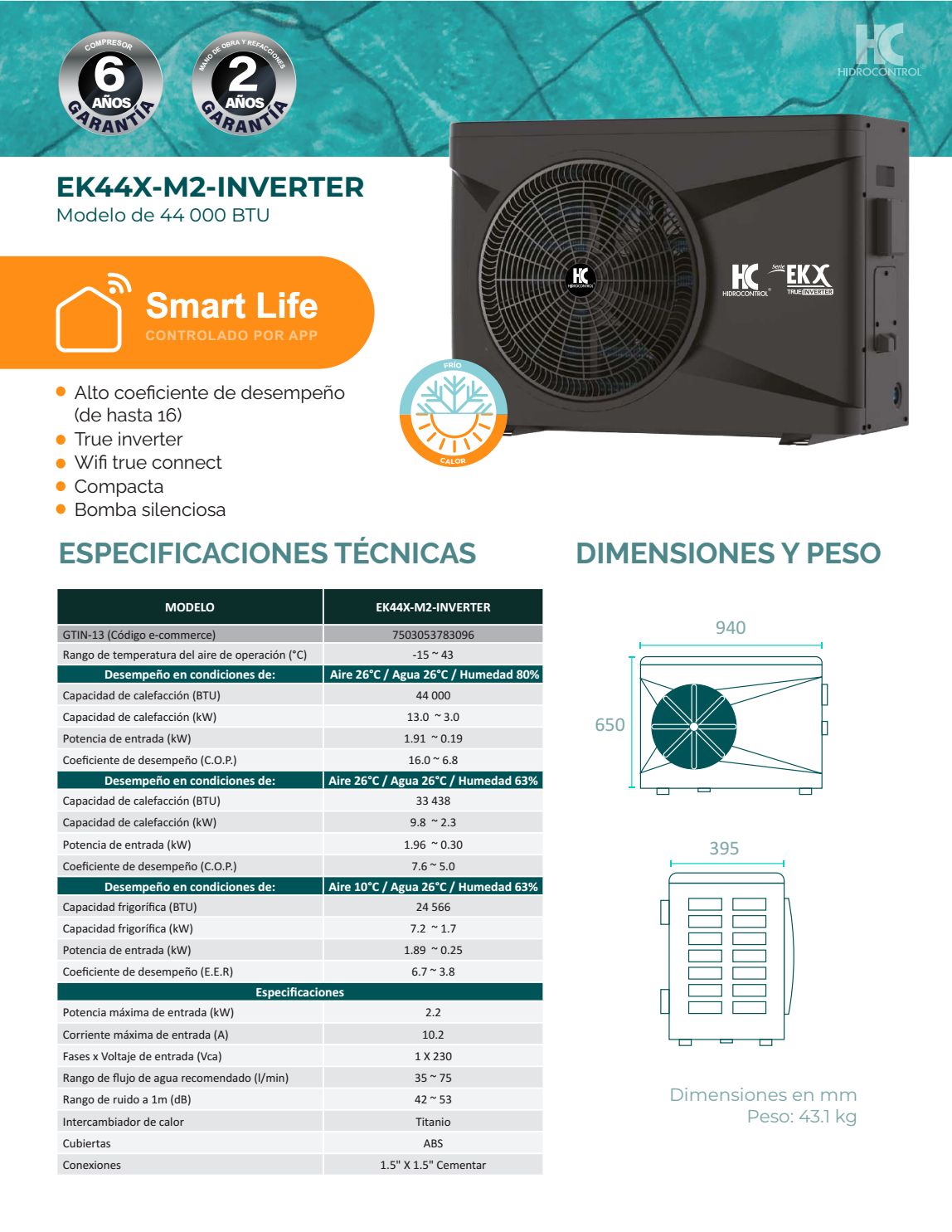 Bomba de calor inteligente Hidrocontrol EK44X-M2-INVERTER 44,000 BTU 1f 230v