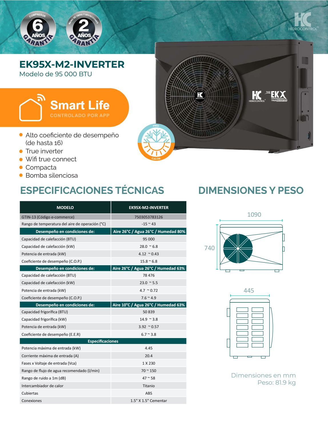 Bomba de calor inteligente Hidrocontrol EK95X-M2-INVERTER 95,000 BTU 1f 230V
