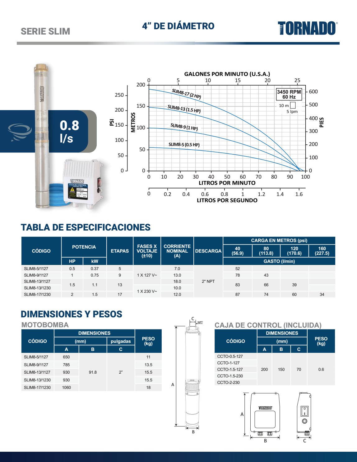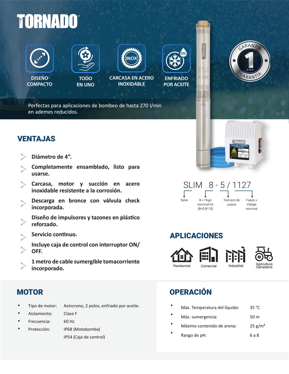 Bomba sumergible tipo bala marca Tornado serie SLIM8-9/1127 1 hp 1f 127v